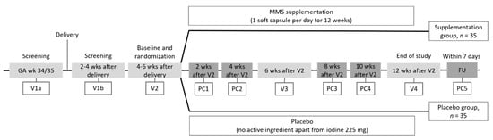 Study design. V1a, first screening; V1b, second screening; V2, randomization and baseline; V3, milk and blood sampling in mothers and measurement of infant anthropometric parameters; V4 (end of study). Phone calls to lactating women carried out between V2 and V4, final follow-up call after V4. FU, follow-up; GA, gestational age; MMS, multiple micronutrients, lutein, and docosahexaenoic acid supplementation; PC, phone call; V, visit; wks, weeks.