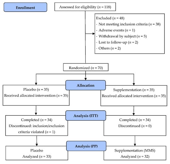 The clinical study was performed between 26 April 2017 and 12 November 2019. Of the 118 subjects assessed for eligibility, 70 were randomized to treatment (35 in each group), all of whom formed the safety evaluation population. Data for the primary efficacy endpoint was available in 65 subjects, who formed the per protocol population (MMS group, n = 32; placebo group, n = 33) (Figure 2). Both groups were similar at baseline (Table 1). The mean age was 31.7 ± 3.8 (21–39) years, 93.8% were Caucasian, and the mean BMI was 25.0 ± 3.78 kg/m2. More pregnancies went to late term in the MMS group (n = 6) than in the placebo group (n = 3), and there was a higher rate of delivery complications within the MMS group (15.6%) versus the placebo group (3.0%), with no subsequent problems.