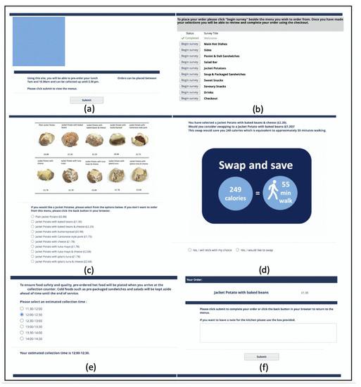 An example user journey of a participant ordering from the Jacket Potato menu. (a) Welcome page; (b) main menu; (c) Jacket Potato menu; (d) prompt to swap the jacket potato with baked-beans and cheese to a jacket potato with baked-beans; (e) estimated collection time selection page; and (f) order summary with a text box for notes for the kitchen.