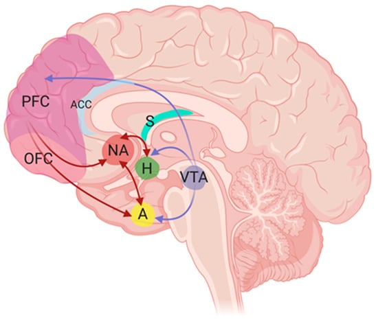 Limbic and reward pathways involved in eating behaviour and appetite. Eating behavior is closely associated with activity of the reward circuitry of the brain, which involves a group of neuronal structures that become activated and release dopamine when exposed to rewarding stimuli like food []. The pathway most associated with reward circuitry of the brain is referred to as the mesolimbic dopamine pathway, which starts with production and release of dopamine in the ventral tegmental area (VTA). The mesolimbic dopamine pathway then relays VTA signaling to the nucleus accumbens (NA), an area associated with motivation. The other aspect of the reward system is known as the mesocortical pathway which connects the VTA to the prefrontal cortex (PFC). This region also includes the orbitofrontal cortex (OFC), a key area involved in cognitive processes, such as decision making and memory. The PFC additionally forms connections with sensory and limbic pathways as well. Importantly, the reward pathway is activated, both before and after receipt of a reward suggesting that dopamine increases reward seeking behavior. Thus, any disruption of these pathways could potentially lead to disordered eating behavior. The VTA is also functionally and anatomically connected to the hypothalamus (H), primarily the lateral hypothalamus. The hypothalamus integrates homeostatic signals from various peripheral organs along with reward responses to modulate food intake and energy expenditure according to changes in metabolic state []. The arcuate nucleus of the hypothalamus (not shown), where neuropeptide Y (orexigenic) and proopiomelanocortin (anorexigenic) producing neurons reside, is the main area responsible for energy sensing and eating behavior. VTA, ventral tegmental area; NA, nucleus accumbens; H, hypothalamus; PFC, prefrontal cortex; OFC, orbitofrontal cortex; A, amygdala; ACC, anterior cingulate gyrus; S, striatum.