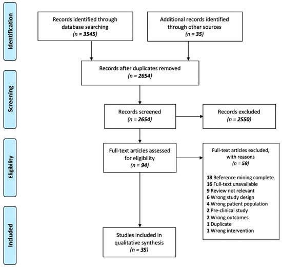 Our initial search revealed 3545 results, which was reduced to 2654 after removal of duplicates. Following title and abstract screening, 94 studies were assessed for full-text eligibility. A total of 35 studies that considered dietary composition, food preference and cravings and/or eating patterns in patients with SCZ or HCs exposed to APs were deemed eligible and included in our qualitative synthesis (Figure 2; preferred reporting items for systematic reviews and meta-analyses (PRISMA) flow diagram).
