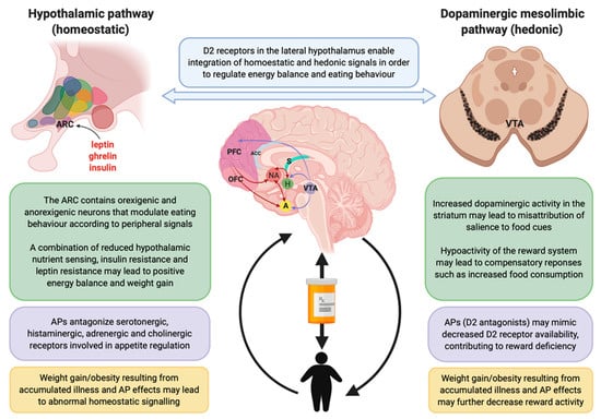 Overview of the homeostatic and hedonic pathways regulating appetite and eating behaviour. Text in green boxes describe the function of each pathway and implications for regulation of eating behaviour; text in purple boxes describes antipsychotic-induced effects; text in yellow boxes describes how weight gain affects pathway function. Abbreviations: VTA, ventral tegmental area; NA, nucleus accumbens; H, hypothalamus; PFC, prefrontal cortex; OFC, orbitofrontal cortex; A, amygdala; ACC, anterior cingulate gyrus; S, striatum; AP, antipsychotic; D2 = dopamine 2.