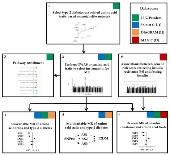 Figure 1 illustrates the workflow of our analysis. First, we selected diabetes-related amino acid traits based on metabolic network structures within EPIC-Potsdam (Figure S1). Second, we identified suitable genetic instruments in genome-wide association studies (GWAS) on diabetes-related amino acid traits within EPIC-Potsdam data (n = 2265). Third, we evaluated the pathway enrichment of the genetic instruments to facilitate biological interpretation facilitating biological interpretation. Fourth, for the selected SNPs, disease associations were extracted from large public GWAS on type 2 diabetes and we performed univariable two-sample MR studies to estimate the causal effects of amino acid traits on type 2 diabetes risk (DIAGRAM data). To complement our results achieved within EPIC-Potsdam data and to gain higher power to generate genetic instruments for single amino acids, we used previously published GWAS data on single amino acid measures []. Fifth, these public data were furthermore used in a multivariable MR to estimate direct causal effects of diabetes-related amino acid traits. Finally, we evaluated the role of pre-existing insulin resistance (defined by fasting insulin in MAGIC data) by applying a reverse MR approach in EPIC-Potsdam and utilizing public GWAS data. Detailed description of data sources follows under the study populations section.