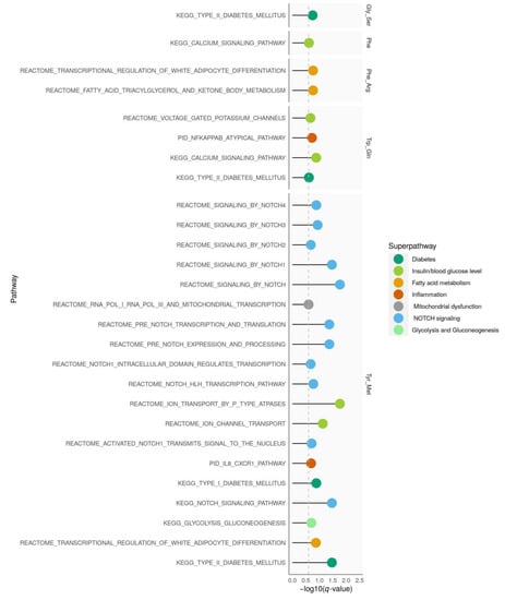 Pathway enrichment analysis. For each amino acid trait, pathways with significant enrichment of SNPs (q-value < 0.25) that mapped to gold standard pathways for type 2 diabetes are shown. Arg, arginine; Gln, glutamine; Gly, glycine; Met, methionine; Ser, serine; Phe, phenylalanine; Trp, tryptophan, Tyr, tyrosine.