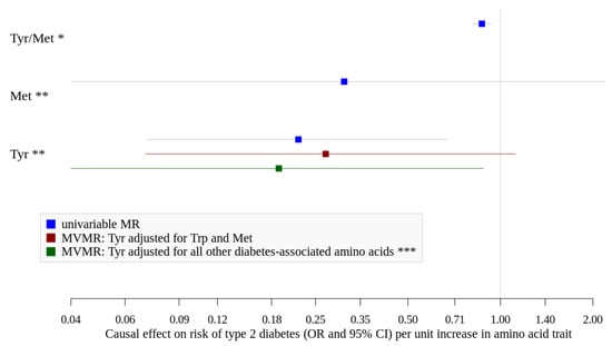 We investigated other diabetes-related amino acid traits using public data and found positive associations for increased levels of valine and leucine in univariable MR (Tables S4 and S5). When we adjusted tyrosine for its direct neighbors in the network (tryptophan and methionine) in multivariable MR, we found an inverse association for higher levels of tyrosine (OR = 0.27 (0.07–1.12), Figure 3), which became stronger and significant after adjustment for all other diabetes-associated amino acids (tryptophan, leucine, isoleucine, valine, glycine, and phenylalanine) (beta = −1.66; OR = 0.19 (0.04–0.88), Figure 2 and Tables S6 and S7) while neither higher levels of BCAA nor glycine, phenylalanine or tryptophan showed significant associations. F-statistics were below 10 for all exposures suggesting potentially weak instruments used in this analysis (Table S6). However, we repeated the multivariable MR by accounting for weak instruments and received comparable effect estimate for tyrosine (beta = −1.76; OR = 0.17 (0.03–0.98), Table S6).