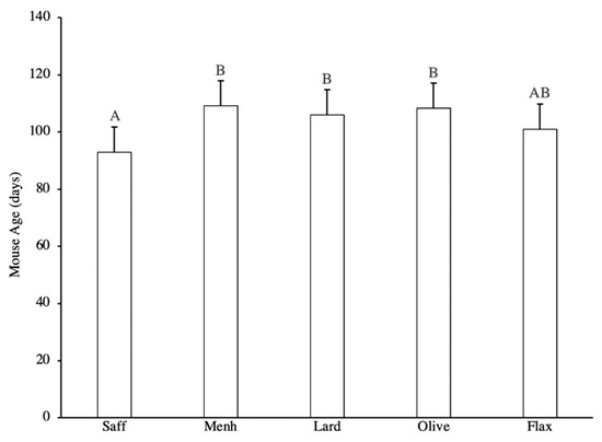 Average tumour latency in mice fed either 10% safflower oil diet (n = 11), 3% menhaden oil diet (n = 10), 3% flaxseed diet (n = 9), 10% olive oil diet (n = 6), or 10% lard diet (n = 10). Groups with a different letter are significantly different according to Tukey’s Studentized Range test (p < 0.05).