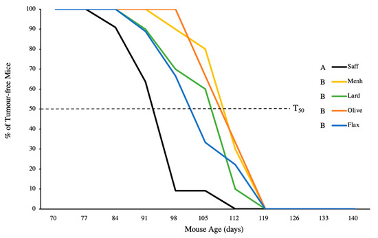 Proportion of mice that remained tumour free over the 20-week experimental period fed either 10% safflower oil diet (n = 11), 3% menhaden oil diet (n = 10), 3% flaxseed diet (n = 9), 10% olive oil diet (n = 6), or 10% lard diet (n = 10). T50 denotes the time at which 50% of mice in a given group developed tumours. Groups with a different letter are significantly different as determined by repeated measures analysis (p < 0.05).