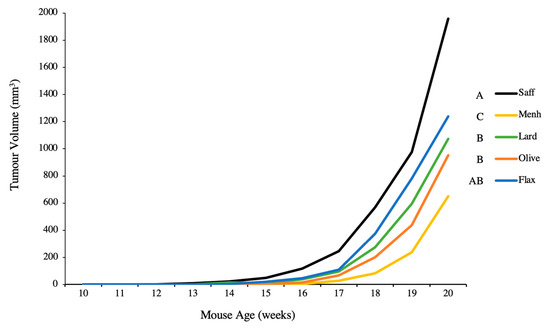 Average tumour volume per dietary intervention over the duration of the study in mice fed either 10% safflower oil diet (n = 11), 3% menhaden oil diet (n = 10), 3% flaxseed diet (n = 9), 10% olive oil diet (n = 6), or 10% lard diet (n = 10). Groups with a different letter are significantly different as determined by repeated measures analysis (p < 0.05).