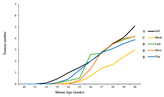 Average tumour number per dietary intervention over the duration of the study in mice fed either 10% safflower oil diet (n = 11), 3% menhaden oil diet (n = 10), 3% flaxseed diet (n = 9), 10% olive oil diet (n = 6), or 10% lard diet (n = 10). Groups with a different letter are significantly different as determined by repeated measures analysis (p < 0.05).