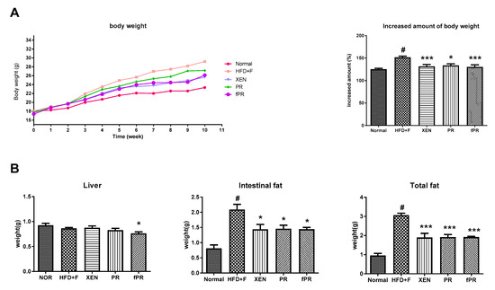 At the termination of the study (10th-week post-treatment), no significant change in food intake was evident among the experimental groups (data not shown). However, at this time, body weight gain and the intestinal and total body fat weights were significantly higher in the HFD+F-fed animals than in the normal group (p < 0.05) (Figure 2A,B). However, liver weight remained unchanged among the groups (Figure 2B). In rodents, a HFD is reported to induce obesity resembling that in the human metabolic syndrome, which is characterized by increased body weight along with induction of steatosis, impaired glucose and lipid metabolism, and low-grade inflammation [48]. Interestingly, treatment of the HFD+F group with XEN, PR, or fPR resulted in significant reductions in body weight gain, as well as intestinal fat and total fat weights (Figure 2B). The above results support those in a recent study that showed that treatment with a PR extract significantly reduced body and epididymal fat weights in HFD+F-treated mice [49]. Notably, in the current study, the body weight gain of the HFD+F-fed mice decreased more significantly in response to the fPR treatment (p < 0.001) than to the PR treatment (p < 0.05) (Figure 2A). It has previously been suggested that a fermented product of PR might be therapeutically more effective than unfermented PR and, therefore, may be useful as a functional food [30].
