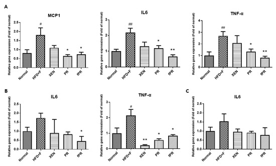 Notably, exposure of the HFD+F-fed mice to PR or fPR, but not XEN, resulted in significant down-regulation of the intestinal tissue expressions of the MCP-1, IL-6, and TNF-α genes (Figure 3A). Further, the inhibitory effect of fPR on the IL-6 and TNF-α gene expressions was more pronounced (p < 0.01) than that of PR (p < 0.05). In contrast, the intestinal fat tissue expression of the IL6 gene in the HFD+F-fed mice was significantly suppressed by fPR (p < 0.05), but not by XEN or PR. Additionally, co-treatment of the HFD+F-fed mice with XEN, PR, or fPR significantly down-regulated the intestinal fat tissue expression of the TNF-α gene and suppressed the expression of the IL6 gene in hepatic tissue, although the latter change was insignificant (Figure 3B,C).