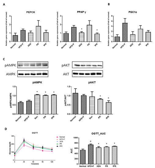 OGTT, a widely used procedure for evaluating whole-body glucose tolerance, has been employed in the assessment of insulin sensitivity [57]. Our OGTT results showed that fasting blood glucose levels were markedly higher at every measurement time (0, 30, 60, 90, and 120 min) in the HFD+F group than in the normal group. However, the glucose level in the HFD+F-fed mice improved when treated with XEN, PR, or fPR, as shown by the OGTT AUC results (Figure 4D). To explore the probable molecular mechanism(s) underlying such beneficial effects of XEN, PR, and fPR, we evaluated the effects of these agents in HFD+F-fed mice on the gene expressions associated with three different proteins PEPCK, PPARγ, and PGC1α, which have key roles in metabolic processes (Figure 4A,B). Among them, PEPCK, which catalyzes a committed, rate-limiting step in hepatic gluconeogenesis by converting oxaloacetate to phosphoenolpyruvate, has a vital role in maintaining a normal blood glucose level [58]. The nuclear receptor PPARγ is a regulator of lipid and glucose metabolism [59], whereas PGC1α, a multifunctional regulatory factor originally identified as a coactivator of PPARγ, has a central role in the regulatory network of glucose metabolism [60] and has been shown to be a metabolic regulator of intestinal epithelial cell fate [61]. In the present study, higher expressions of PEPCK and PPARγ genes in liver and a higher expression of PGC1α gene in intestine were observed in the HFD+F-fed mice compared to the expression levels in the normal group; however, the differences were statistically insignificant. Indeed, other studies have shown high hepatic gene and protein expressions of PEPCK and PPARγ in standard diet-fed mice compared to that in HFD-fed mice [62,63]. Moreover, PGC1α expression has been shown to be increased in the liver and pancreas of animal models with obesity and diabetes [64,65,66]. We noticed an insignificant but definite reduction in the hepatic expressions of PEPCK and PGC1α genes in the HFD+F-fed mice in response to treatment with XEN or fPR. An earlier study concluded that suppression of hepatic PEPCK expression may be a preventive or therapeutic strategy for metabolic diseases [67]. We also observed a significant reduction in the hepatic expression of PPARγ gene in the HFD+F group upon exposure to XEN and fPR, but not to PR. In an earlier study, using HepG2 cells as a model, we showed that down-regulation of PPARγ may contribute to the protective effect of herbal medicines against free fatty acids-induced hepatic steatosis [68]. On the other hand, AMPK, the function of which has been extensively studied in muscles and liver, has a central role in maintaining cellular energy homeostasis [8, 39, 69]. Activation of AMPK through phosphorylation induces pathways that increase energy production (glucose transport and fatty acid oxidation) and switches off pathways that utilize energy (lipogenesis, protein synthesis, and gluconeogenesis) [69]. Notably, in this study, phosphorylation of hepatic AMPK was significantly enhanced in the HFD+F-fed mice upon co-treatment with XEN, PR, or fPR (Figure 4C). This was accompanied by a significant reduction in the phosphorylation of AKT in both the PR and fPR groups compared to that in the HFD+F-fed mice (Figure 4C). Obesity has been reported to be a risk factor for nonalcoholic fatty liver disease (NAFLD), a disease spectrum characterized by excess fat accumulation in the hepatocytes leading to a number of pathophysiological conditions including hepatic steatosis (nonalcoholic fatty liver, NAFL), nonalcoholic steatohepatitis (NASH), and cirrhosis [70,71]. Excess hepatic accumulation of collagen via its synthesis (fibrogenesis) in the liver has a key role in the progression of NAFLD [72]. An accumulation of evidence indicates that PR possesses hepatoprotective activity and prevents liver fibrosis [73,74,75,76], and it has been reported that PR exerts an anti-fibrotic effect on the liver via suppression of the PI3K/AKT pathway to inhibit the over-accumulation of collagen [76].