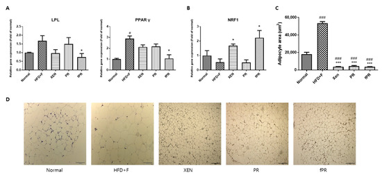 As expected, histological analysis of the intestinal adipose tissue showed that mice in the HFD+F group had significantly larger (p < 0.001) adipocytes than those in mice in the normal group (Figure 5C,D). In addition, there was significantly higher intestinal fat tissue expression of the PPARγ gene in the HFD+F group than in the normal group. These observations support those in a previous study on mice [77]. Moreover, hepatic and intestinal fat tissues showed higher and lower mRNA levels of LPL and NRF1, respectively, in the HFD+F group than in the normal group, although the differences were statistically insignificant (Figure 5A,B). PPARγ is reported to be an essential factor for adipogenesis and to have a key role in the maintenance of the differentiated state of adipocytes [78]. In addition, it has been reported that xanthigen, a nutraceutical combination used in weight management, can attenuate HFD-induced obesity through down-regulation of PPARγ in adipose tissue [79]. Indeed, there is recent evidence that PPARγ repression has the beneficial effects of reducing body weight and improving insulin sensitivity, suggesting a potential clinical role of PPARγ antagonists in obesity and type 2 diabetes [79,80]. On the other hand, LPL, a rate-limiting enzyme, catalyzes the hydrolysis of the triglyceride (TG) core of circulating TG-rich lipoproteins such as chylomicrons, low-density lipoproteins, and very-low-density lipoproteins [81]. Several lines of evidence indicate that overexpression of LPL causes insulin resistance [82] and promotes obesity [83]. NRF-1, a transcription factor, has a key role in the regulation of mitochondrial biogenesis; moreover, it has been shown to attenuate obesity and has been linked to the expression of genes involved in lipid metabolism [84]. In our study, co-treatment of the HFD+F group with XEN, PR, or fPR reduced the adipocyte size compared with that of the HFD+F group in a highly significant manner (p < 0.001) (Figure 5C,D), whereas exposure of the HFD+F group to fPR, but not XEN or PR, significantly reduced the intestinal adipose tissue expressions of both the PPARγ and LPL genes. On the other hand, the intestinal fat tissue mRNA level of NRF1 was significantly increased in the HFD+F-fed mice upon treatment with XEN or fPR, but not PR (Figure 5B). Taken together, these findings indicate it is conceivable that both PR and fPR can exert marked anti-obesity effects on a HFD+F-diet group. However, fPR appears to be more potent than PR in improving the pathways related to glucose and lipid metabolism in HFD+F-fed animals.