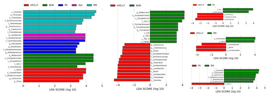 The LEfSe profile further demonstrated that the populations of Bacilli, Lactobacillales, Lachnospiraceae, Erysipelotrichaceae, Streptococcaceae, Lactococcus, and Dorea were enriched in the HFD+F group (Figure 6). Higher levels of Erysipelotrichaceae have been associated with metabolic disorders, and an approximately 2.5-fold decrease in the abundance of Erysipelotrichaceae taxa in a hamster model of hypercholesterolemia was observed in response to treatment with an extract purported to improve cholesterol homeostasis [94,95]. Additionally, our results revealed that Erysipelotrichaceae abundance was positively correlated with body, liver, and intestinal weights, as well as with intestinal and adipose tissue expression levels of TNF-α and IL-6 and the hepatic LPL level (Figure S3). In parallel, we observed that Lachnospiraceae was positively and significantly correlated with body, liver, and intestinal weights, as well as with intestinal IL-6 and hepatic LPL levels (Figure S3). It has been reported that members of the Lachnospiraceae family are associated with the presence of type 2 diabetes and obesity [96]. In addition, our study showed that Dorea abundance was positively and significantly correlated with body, liver, and intestinal weights, as well as with intestinal and adipose tissue levels of IL-6 and the hepatic LPL level (Figure S3). This is in agreement with a previous report demonstrating that Dorea presence is associated with metabolic disorders [95].
