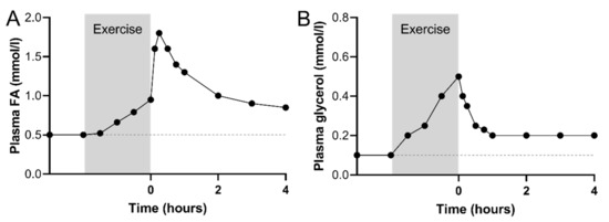Representative illustration of plasma fatty acid (FA) (A) and glycerol (B) concentrations during moderate-intensity exercise (80 min to 4 h at 40%–70% of maximal oxygen consumption rate (VO2peak)) and in early recovery in endurance-trained subjects. Subjects remained fasted in recovery. The scatter plots are based on data in references [3,6,12,13,18].