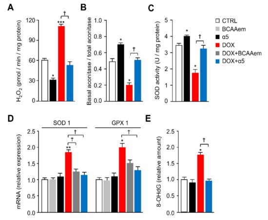 - D’Antona, G.; Ragni, M.; Cardile, A.; Tedesco, L.; Dossena, M.; Bruttini, F.; Caliaro, F.; Corsetti, G.; Bottinelli, R.; Carruba, M.O.; et al. Branched-Chain Amino Acid Supplementation Promotes Survival and Supports Cardiac and Skeletal Muscle Mitochondrial Biogenesis in Middle-Aged Mice. Cell Metab. 2010, 12, 362–372. [Google Scholar] [CrossRef] [PubMed]