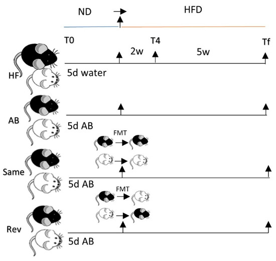 Study design. Study was performed on 4 groups each composed of 12 A/J and 12 C57 BL/6J (C57) mice treated with (1) only HFD; (2) AB and HFD; (3) AB, FMT from same strain, and HFD; (4) AB, FMT from the opposite strain, and HFD. ND, normal diet; HFD, high-fat diet; T0, before HFD treatment; T4, 2 weeks of HFD treatment; Tf, 7 weeks of HFD treatment; D, day; AB, antibiotic treatment; FMT, fecal microbiota transplantation; white mouse, A/J; black mouse, C57.