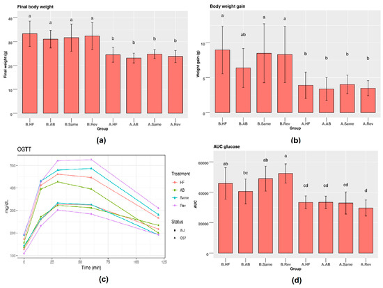(a) Body weight and (b) body weight gain in different groups/strains; (c) serum glucose levels within 120 min following acute glucose challenge; (d) area under the curve (AUC). Mean ± SD, n = 12 mice per strain/group. A: A/J, B: C57. Tukey’s multiple comparison tests was used to compare groups with different treatments. p < 0.05 was considered significant.