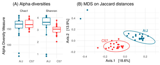 (A) Comparison between Shannon and Chao1 diversity indices for C57 (n = 23) and A/J (n = 23) groups. Chao1 estimates number of species, whereas Shannon estimates effective number of species. A/J and C57 did not differ in terms of Chao1 richness (p = 0.28, t-test), but A/J had higher Shannon richness (p < 0.05, t-test). (B) Principal Coordinate Analysis (PCoA) plot based on Jaccard distance between samples. A/J and C57 mice exhibited different microbial composition (p < 0.001, analysis of similarity test using Adonis function from vegan package with 999 permutations).