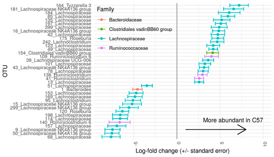 Log fold change of OTUs (Operational Taxonomic Units) with differential abundances (p < 0.00011e−4) in A/J (n = 23) and C57 (n = 23) mice. OTUs present in less than 25% of samples or with read count lower than 50 were filtered out. Differential abundance was tested using negative binomial model implemented in DESeq2 and p-values corrected with False Discovery Rate (FDR) procedure.