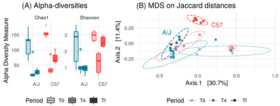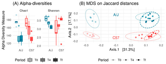 We analyzed the gut microbiota composition at the three time points in mice from the AB groups in the two mice strains. As expected, bacteria richness dropped after AB treatment in both A/J and C57 strains. The Shannon diversity index was reduced in both mice strains after AB treatment, but C57 recovered quickly and returned to close to normal diversity (Figure 9A). Principal-coordinate analysis of the Jaccard distances showed that AB treatment quickly altered the intestinal microbiota of both strains (T4). In accordance to richness and diversity, microbiome profiles in C57 mice continued to change between T4 and Tf, while no further AB effect was noted in A/J mice after T4 (Figure 9B).