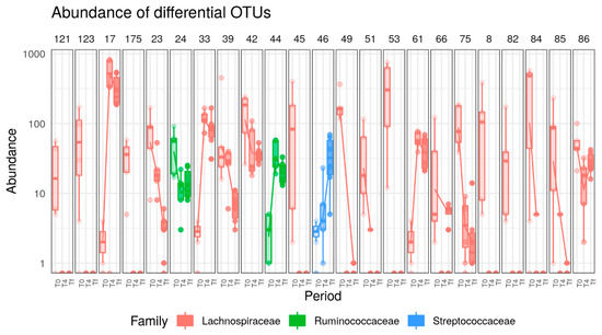 In A/J mice under AB treatment, 45 OTUs were significantly different between T0 and Tf. Interestingly, they all belonged to Firmicutes, with the exception of one Bacteroidetes OTU, including 26 Lachnospiraceae, 16 Ruminococcaceae, one Clostridiales vadinBB60 group, one Peptostreptococcaceae and one Bacteroidales S24-7 group. Only one Peptostreptococcaceae was significantly increased at T4 and Tf compared to T0, while all 44 other significantly different OTUs were decreased (Figure 10).