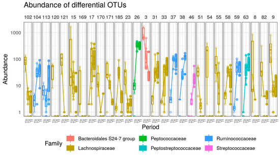 Boxplots of OTUs whose abundance changed (p < 0.0001) in response to HFD (p < 0.0001) in C57 mice. OTUs present in fewer than three samples (out of 16) or with read count lower than 50 were filtered out. Differential abundance was tested using negative binomial model implemented in DESeq2 and p-values corrected with the FDR procedure. Numbers above figure correspond to unique ID of each OTU (e.g., 102 for first one).