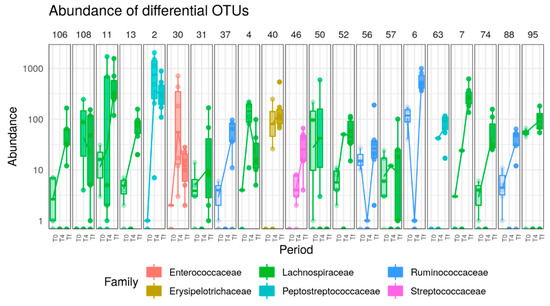Boxplots of OTUs whose abundance changed (p < 0.0001) in response to AB treatment (p < 0.0001) in A/J mice. OTUs present in fewer than three samples (out of 16) or with read count lower than 50 were filtered out. Differential abundance was tested using negative binomial model implemented in DESeq2 and p-values corrected with the FDR procedure. Numbers above figure correspond to unique ID of each OTU (e.g., 145 for first one). In C57 mice, 23 OTUs (all from Firmicutes phylum) were significantly increased following AB treatment at Tf while one bacterium from Lachnospiraceae NK4A136 group was decreased (Figure 11).