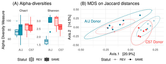 At the phylum level, the microbiome exchange between the two strains appeared effective. Indeed, C57-Rev and A/J-Rev displayed a microbiota profile close to that of the other strains (A/J-Same and C57-Same, respectively). Mainly, A/J-Rev mice showed a higher prevalence of Bacteroidetes compared to A/J mice receiving a microbiome from an A/J donor (A/J-Same; Figure 13A).