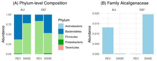 (A) Phylum-level composition of A/J-Rev (n = 6), A/J-Same (n = 6), C57-Rev (n = 6), and C57-Same (n = 5) groups after microbiome transfer. (B) Impact of microbiome exchange on the relative abundance of the Alcaligenaceae family.