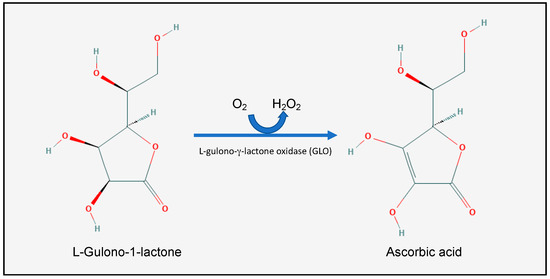 L-Ascorbic acid (AA), or vitamin C (Figure 1), is a water-soluble vitamin which is found in all fruits and vegetables, but is particularly concentrated in citrus fruits, green peppers, strawberries, broccoli, green leaves, and potatoes [15]. It was first isolated between 1927 and 1930 from ox adrenals by the Nobel laureate Albert Szent-Györgyi at Cambridge University and the Mayo Clinic. Most animal species synthesize vitamin C in the kidneys or the liver. Humans, some mammals (such as gorillas, monkeys, bats, and guinea pigs), birds, and fish, however, have lost the ability to synthesize vitamin C [16]. More specifically, these species lost the ability to synthesize the l-gulono-γ-lactone oxidase (GLO) enzyme, which catalyzes the last step in the vitamin C synthesis: oxidizing l-Gulono-1-lactone into l-Ascorbic acid [16]. The human GLO gene was inactivated by random mutations somewhere between 38 and 92 million years ago [17]. This gene loss was compatible with survival, however, because of the abundance of vitamin C in the human diet [18].