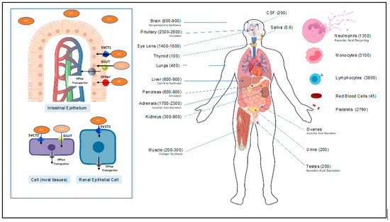 Ascorbic Acid (AA) and dehydroascorbic Acid (DHA) transporters (left). Concentration of AA and DHA in human organs and cells in uM (right). Inspired by Padayatty and Levine [25].