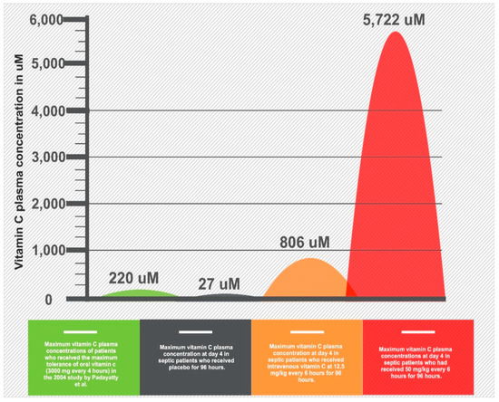 Subnormal plasma vitamin C concentrations are common in critically ill patients and, in particular, patients with sepsis [26,27,32,113]. Furthermore, lower vitamin C levels correlate with higher incidence of organ failure and worse outcomes in septic patients [93]. In fact, very low plasma vitamin C levels, averaging around 18 uM, are a predictable feature in severely septic patients [114]. This is caused by the explosive cytokine release present in sepsis, which interferes with the cellular regulation of vitamin C absorption. Seno et al. showed that inflammatory cytokines, such as TNFα and IL-1β, known to be present in sepsis, negatively regulate endothelial SVCT2 activity; this results in the depletion of intracellular vitamin C levels [115]. In addition, during this overwhelming disease state of oxidative stress and increased reactive oxygen species (ROS) production, there is increased vitamin C consumption by the somatic cells and by leukocyte turnover [40]. As Figure 2 suggests, leukocytes can have an up to 100-fold increase in the concentration of vitamin C compared to plasma. The increased production and turnover of those cells contributes to vitamin C depletion in sepsis [40].