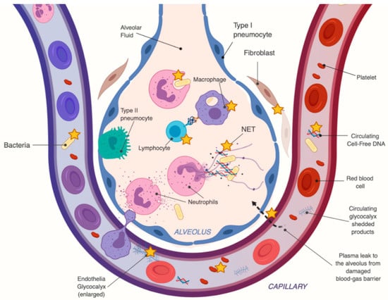Pleiotropic effects of high-dose intravenous vitamin C (HDIVC) in sepsis-induced acute respiratory distress syndrome (ARDS). The orange star [✯] points to possible therapeutic targets of HDIVC. The figure illustrates a human alveolus with the capillary membrane, and the blood-gas barrier during sepsis.