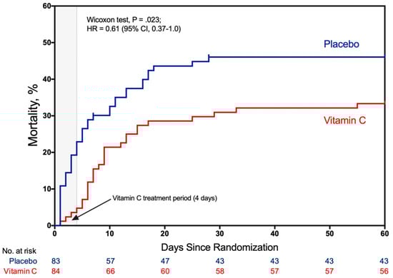 The largest trial completed on vitamin C to date, the CITRIS-ALI trial, was published in 2019 [134]. This multicenter, randomized, double-blinded trial included 167 patients with sepsis and ARDS who were randomized to receive 50 mg/kg every 6 h of HDIVC for 4 days versus placebo and showed statistically significant difference in 28-day all-cause mortality. The 28-day mortality was 29.8% in the vitamin C group versus 46.3% in the placebo group, although this was a secondary outcome. The statistical effect on mortality remained for up to 60 days following trial completion. The most dramatic reduction in mortality was noted during the period of HDIVC infusion (Figure 5). Furthermore, the HDIVC group had a strong trend towards more ventilator-free days (13.1 in the HDIVC group vs 10.6 in the placebo group mean difference, 2.47, 95% CI −0.90–5.85, p = 0.15), ICU-free days to day 28 (10.7 in HDIVC group vs. 7.7, in the placebo group, p = 0.03), and more hospital-free days (22.6 in HDIVC group vs. 15.5, respectively, p = 0.04). This trial did not find significant reductions in the SOFA scores, C-reactive protein, thrombomodulin or procalcitonin. Those biomarkers and scores, however, were not measured among the patients who “graduated” early from the ICU (a group that was heavily shifted towards the HDIVC group) or in those patients who died (heavily shifted towards the placebo group), indicating a strong selection bias, which makes these results difficult to interpret. Several other randomized controlled trials of HDIVC are under way, such as the VICTAS trial, and the Clinical Trials Network for the Prevention and Early Treatment of Acute Lung Injury (PETAL Network) is currently planning a randomized controlled trial of HDIVC for the prevention of ARDS.