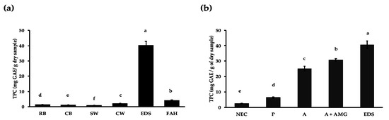 Total polyphenol content (TPC) in bean fractions (a) and during digestion with individual enzymes (b). TPC content was evaluated in raw beans (RB; acidified methanol extraction), cooked beans (CB; acidified methanol extraction), soaking (SW) and cooking water (CW), enzymatic digestion supernatants (EDS which refers to digestion with amylase, amyloglucosidase and protease) of cooked beans and fibre acid hydrolysis supernatant (FAH). (b) TPC in supernatants following digestion with protease (P), pancreatic α-amylase (A), pancreatic α-amylase and amyloglucosidase (A + AMG) and combined enzymes (EDS). No enzyme control (NEC) refers to undigested bean supernatant. Different letters indicate statistically different values among samples according to a post-hoc comparison (Tukey’s test) at p ≤ 0.05.