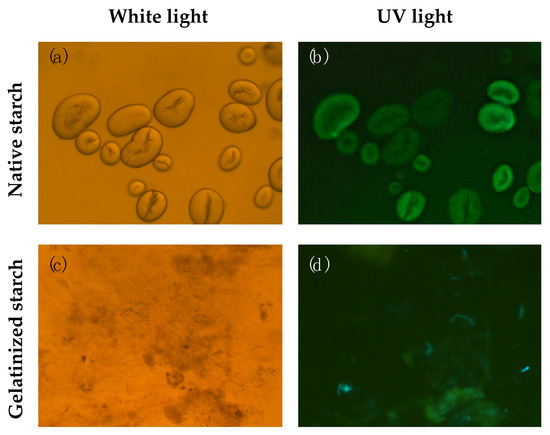 Microscopic images of native and gelatinized Borlotti bean starch with the same frame, observed under white and UV light illumination (280 nm). Starch granules isolated from Borlotti beans observed under white light illumination with phase contrast (a) and observed under UV light (b) indicating the localization of polyphenols or other fluorescent molecules within the granules. The starch granule structure is lost after gelatinization (c) florescence is still observed in gelatinized starch aggregates (d).
