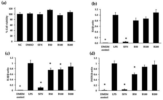 When incubated with concentrations up to 200 μg/mL of cooked bean extract, macrophage viability was not affected (Figure 3a). The exposure of cells with cooked bean extract at concentrations of 50 and 100 μg/mL decreased mRNA levels of inflammatory marker IL1β by 25% and 22% respectively, in comparison to the LPS control (Figure 3c). In addition, iNOS mRNA levels were decreased by 40% at a concentration of 50 μg/mL, but not at higher concentrations (Figure 3d). No significant change in IL6 mRNA levels was observed (Figure 3b). The effect of bean extract was significantly smaller than the effect of sulforaphane (5 µM) for all three target genes.