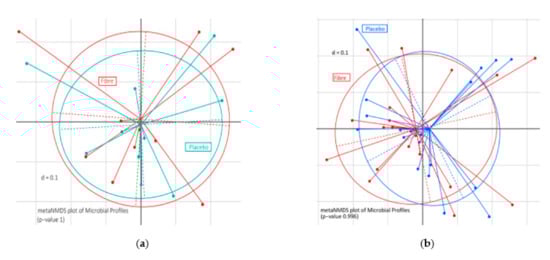 Fecal microbiota analysis by 16 S rRNA gene amplicon analysis. (a) Extrinsic wheat fiber-enriched foods, and (b) extrinsic wheat fiber-enriched drink. metaNMDS is meta non-parametric, multidimensional scaling plot of phylogenetic distances based on generalized UniFrac (beta-diversity).