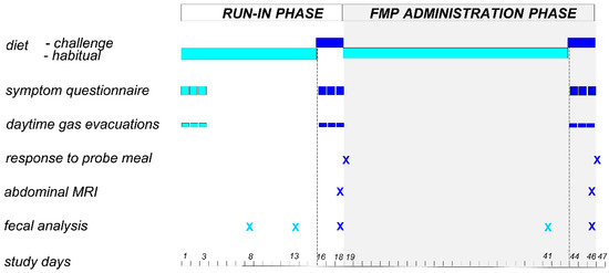 No differences in the volume of intestinal gas measured by abdominal MRI were detected during the FMP administration. In a previous study, 3-day dietary interventions comparing high-fiber (35 g/d) versus low-fiber (8 g/d) diets did not result in significant changes in colonic gas volume measured by MRI during fasting [26]. Intestinal gas homeostasis is tightly regulated to maintain the volume of intraluminal gas constant under different conditions. Indeed, over 70% of the gas produced in the process of microbiota fermentation of meal residues is absorbed into the blood and eliminated by breath [28], and another part of the gas produced is disposed by gas-consuming microorganisms [5].