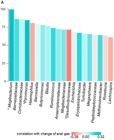 Random forest relative variable importance of most relevant microbiota genera associated with change in clinical parameters upon fermented milk product (FMP) consumption. Top 20 most important variables from random forest to predict changes between study conditions “flatulogenic diet” and “flatulogenic diet + FMP” of (A) anal gas (number of anal gas evacuations) and (B) flatulence. Strength and significance of Spearman correlations (rho coefficient) are indicated in the color shade. Red: change in microbiota genera negatively associated with the change in clinical parameter. Blue: change in microbiota genera positively associated with the change in clinical parameter. * (p < 0.05).