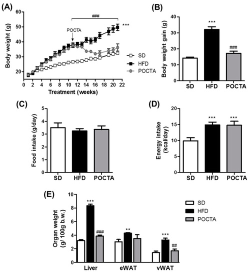 The effect of a pomace olive oil concentrated in triterpenic acids (POCTA) diet on body weight, food, and energy intake and organ weights. Body weight progression before and after the nutritional intervention in diet-induced obese (A), total body weight gain during 21 weeks of diet administration (B), food intake (C), caloric intake (D), and organ weights (E), of mice fed a standard diet (SD), high-fat diet (HFD), or POCTA diet. Values are mean ± SEM (n = 6–11) and are normalized relative to the control group. ** p < 0.01, *** p < 0.001 vs. SD; ## p < 0.01, ### p < 0.001 vs. HFD.