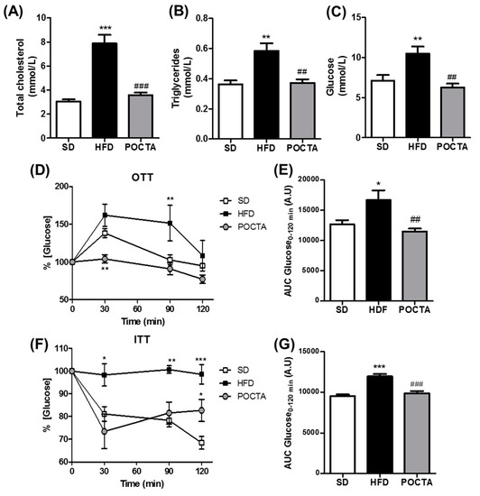 Then, the effect of the POCTA diet on insulin sensitivity was evaluated by performing ITT. This test revealed an impaired insulin sensitivity in HFD-fed mice compared to the SD group (Figure 2F,G). Obese mice that were switched to a POCTA diet evidenced significant improvement in insulin sensitivity, as indicated by a decline in glucose levels at 30 min (Figure 2F) and a lower AUC compared to HFD mice (Figure 2G).