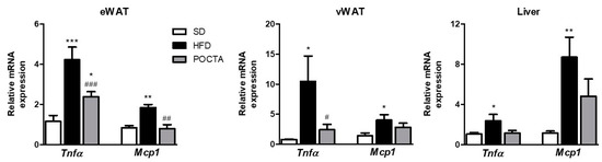 The effect of a POCTA diet on mRNA levels of pro-inflammatory cytokines (Tnf-α) and chemokines (Mcp1) in epididymal white adipose tissue (eWAT) (A), epididymal white adipose tissue (vWAT) (B), and liver (C), of mice fed the SD, HFD, or POCTA diet. Values are mean ± SEM (n = 5–7) and are normalized relative to the control group. * p < 0.05, ** p < 0.01, *** p < 0.001 vs. SD; # p < 0.05, ## p < 0.01, ### p < 0.001 vs. HFD.
