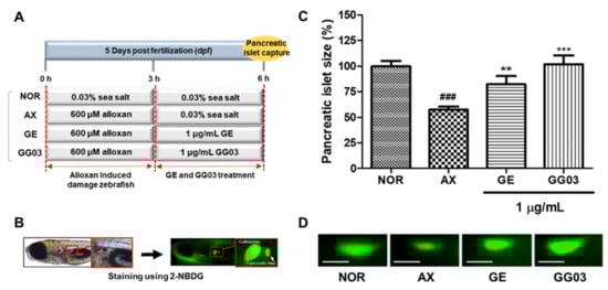 Effect of GE and GG03 on alloxan-induced pancreatic islet-damaged zebrafish. (A) Experimental scheme (B) Pancreatic islet identification using 2-NBDG dye. (C) Pancreatic islet size of each group. (D) Pancreatic islet images. (### p < 0.001; compared to normal), (** p < 0.01, *** p < 0.001; compared to alloxan). Scale bar = 100 μm.