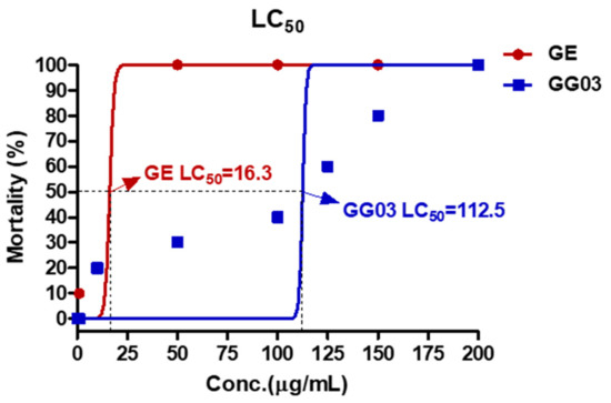 2.7. The 50% Lethal Concentration (LC50) Values of GE and GG03