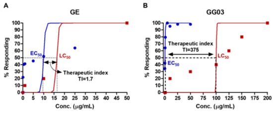 The therapeutic index (TI) of GE and GG03 were calculated by LC50/EC50. The TI is used as an index of drug safety with safer drugs having a higher TI. The TIs of GE and GG03 were calculated at 1.7 and 375, respectively (Figure 4).