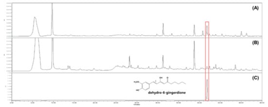 HPLC spectra of GG03 (A; 10,000 ppm) and GE (B; 10,000 ppm) and 1-dehydro-6-gingerdione (C; 100 ppm). HPLC analysis was carried out as described in the Materials and Methods section. Quantitative analysis was replicated three times. Chromatograms shown represent the best of three experiments.