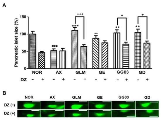 Effect of ginger extract (GE), steamed ginger extract (GG03) and 1-dehydro-6-gingerdione (GD) on KATP channels in alloxan-induced diabetic zebrafish: action of diazoxide (DZ) in the efficacy of GE, GG03 and GD. (A) Pancreatic islet size of each group. (B) Pancreatic islet images. (### p < 0.001; compared to NOR), (* p < 0.05, ** p < 0.01, *** p < 0.001; compared to AX), ++ p < 0.05, +++ p < 0.001).