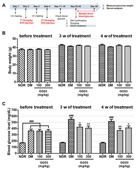 Body weights and glucose levels in diabetic mice. (A) Experimental scheme. (B) Body weight of each group. (C) Blood glucose level of each group. (### p < 0.001; compared to NOR), (* p < 0.05, ** p < 0.01; compared to DM).